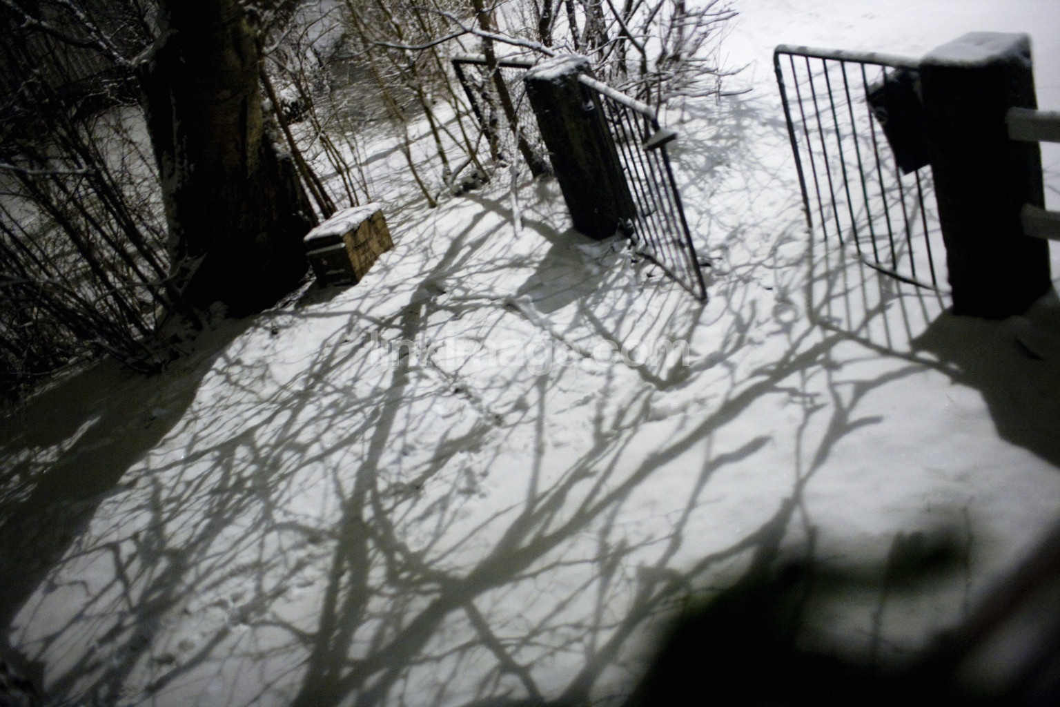 house, blank, night, gate, snow, shadow, winter, light, dark, suburb, villa, reflection
