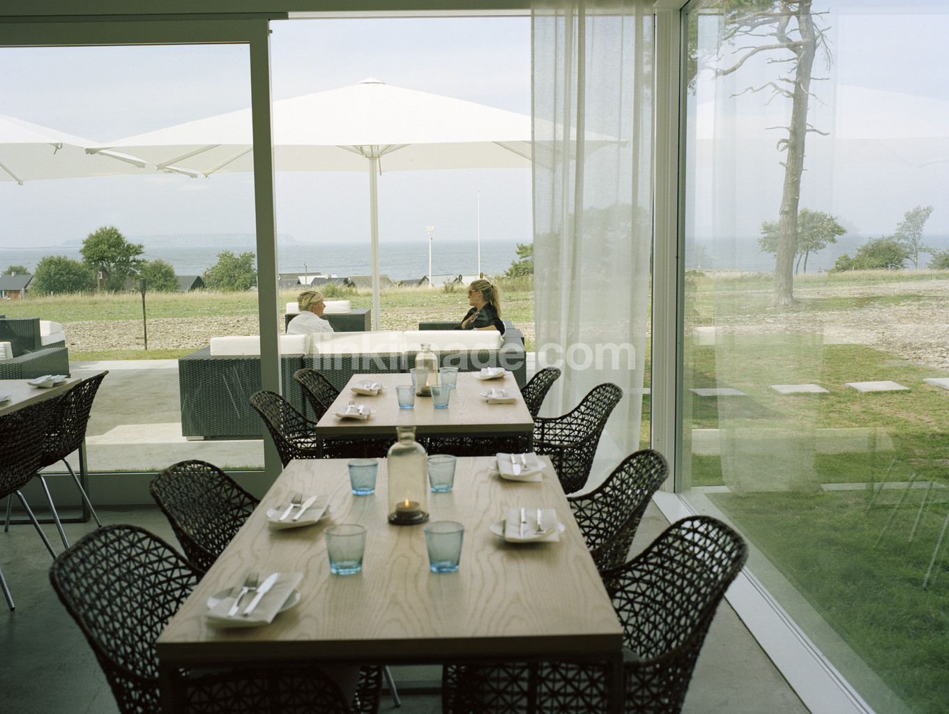 view, views, people, table, chairs, dishes, glass, local, restaurant, window, parasol, tree, grass