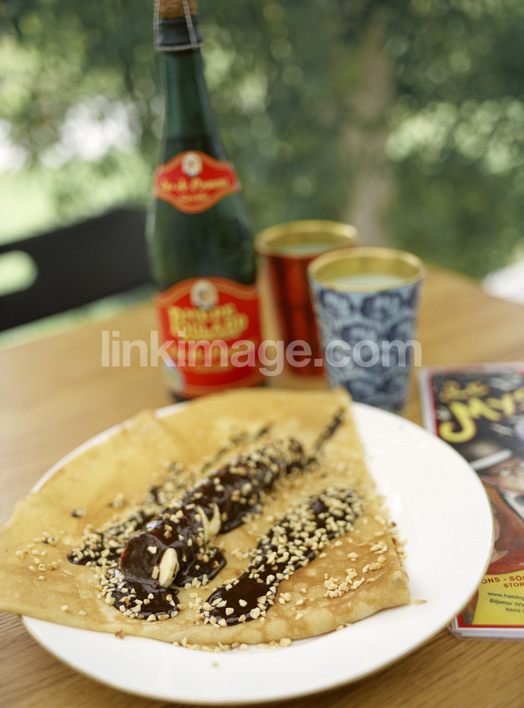 - food, pancake, crepe, plate, sauce, chocolate, table, glass, journal, bottle