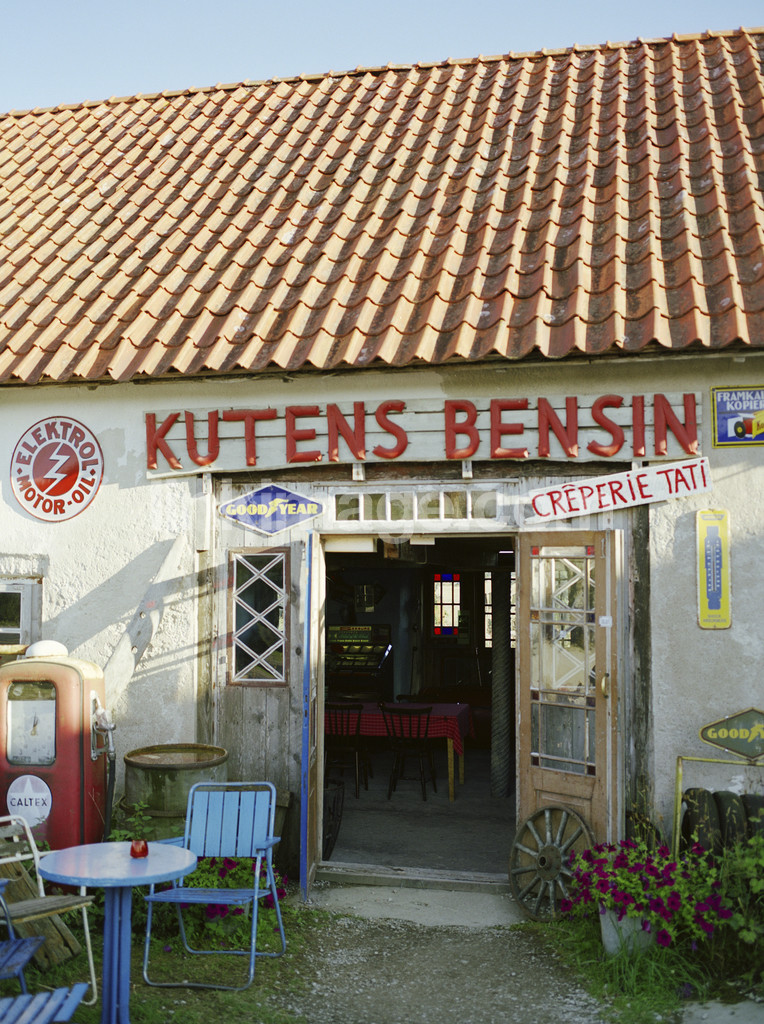 gasoline, mack, kiosk, chair, table, house, ceiling, entrance, output, signs, advertising
