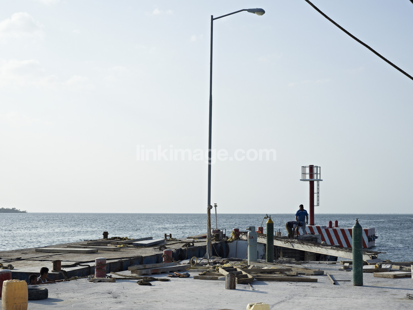 bridge, people, lamp, lamppost, poles, float, string, wire, sky, water, sea, lake, horizon