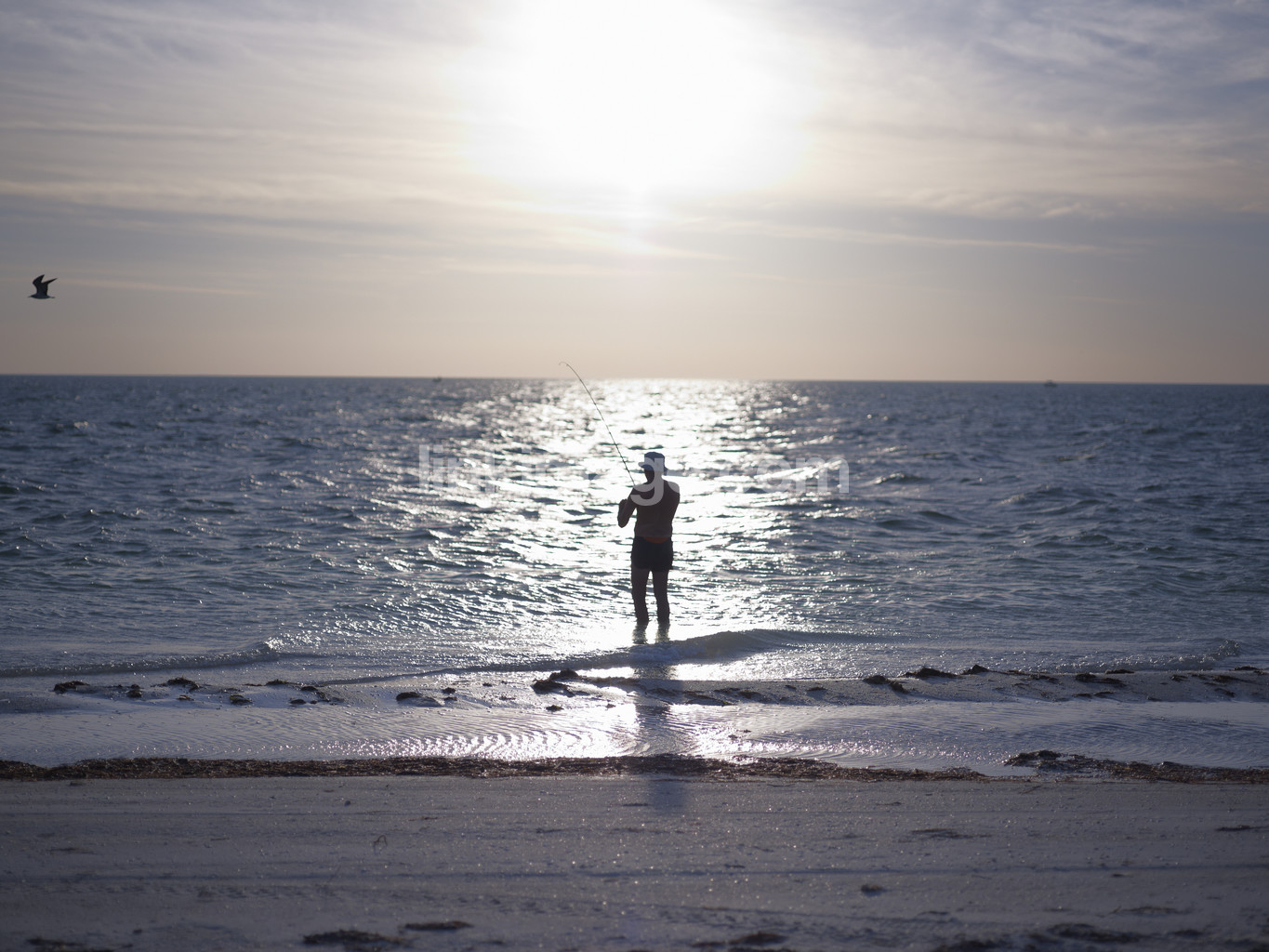 - fishing, fish, fishing rod, rod, fisherman, human, water, sea, lake, bird, fly, sun, cloud, light, reflection