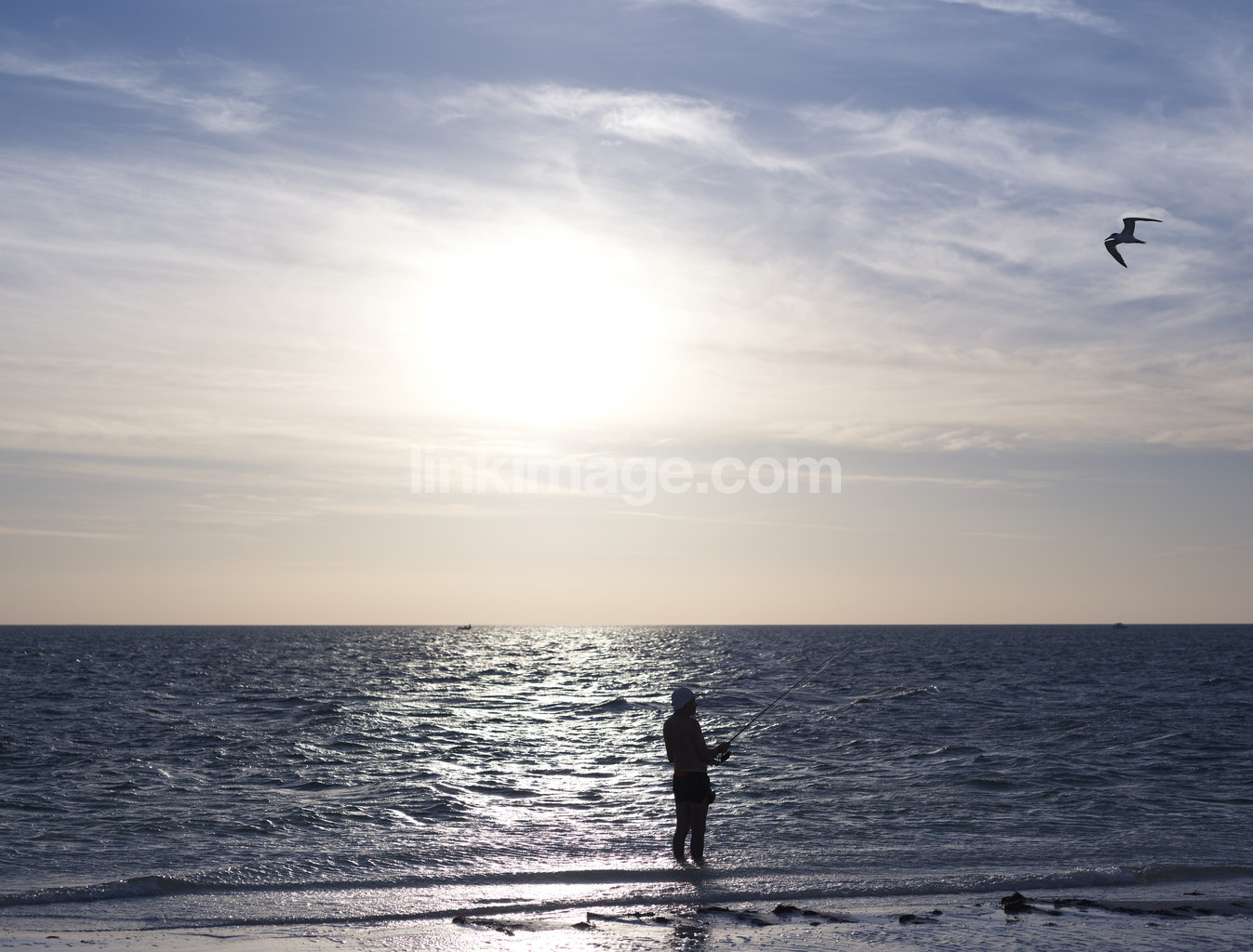 fishing, fish, fishing rod, rod, fisherman, human, water, sea, lake, bird, fly, sun, cloud, light, reflection