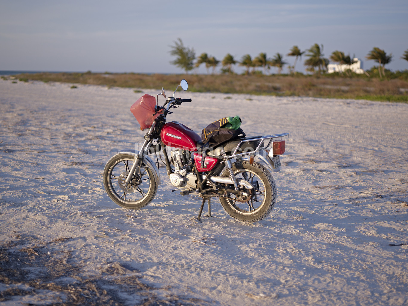 mc, motorcycle, moped, sand, shore, parked, grass, tree, plants, palms, wind, blown
