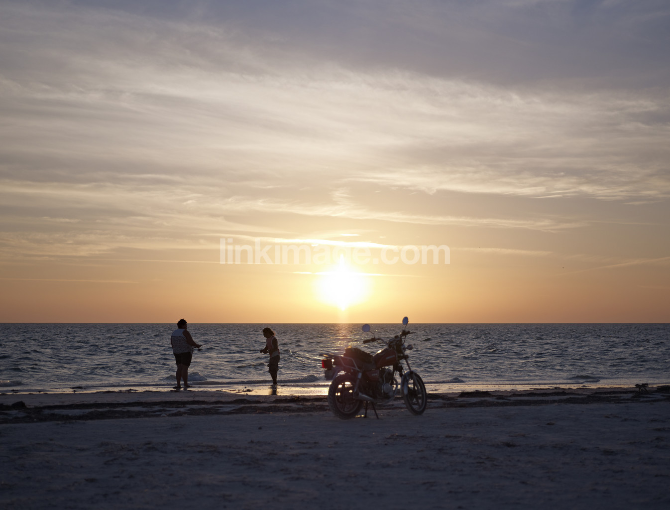 motorcycle, mc, people, sun, sunset, sunrise, dusk, dawn, water, sea, lake, sky, horizon, cloud, shore, sand