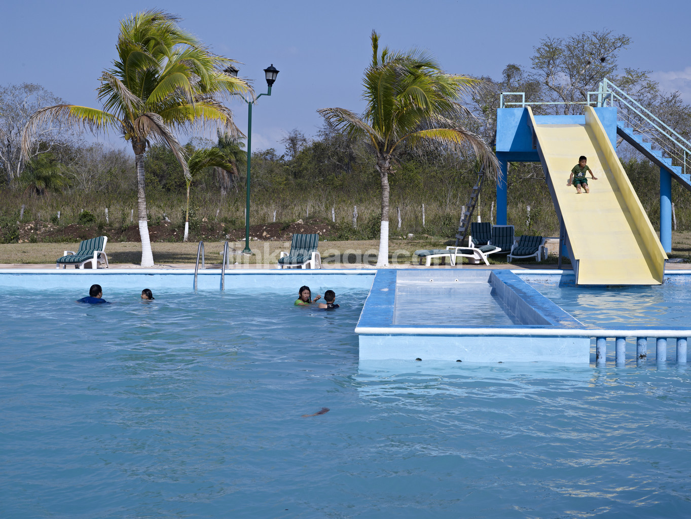 bath, pool, water, palms, holiday, leave, children, play, slide, sunbathing, blue