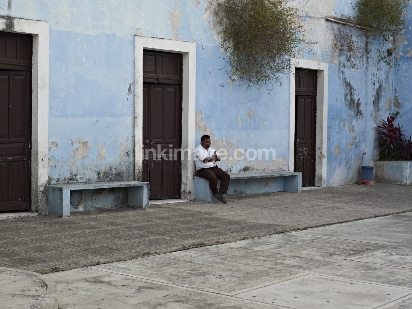 building, house, male, sit, rest, arms, in, cross, benches, doors, entrance, blue