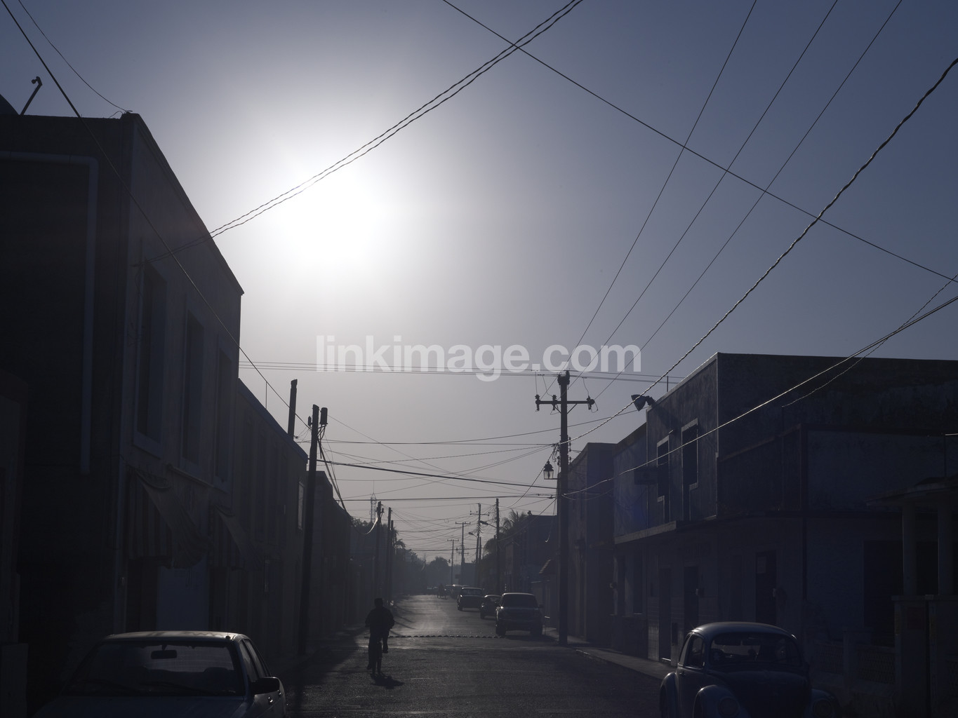 sun, light, dark, backlight, cables, lines, buildings, house, road, car, post, sky