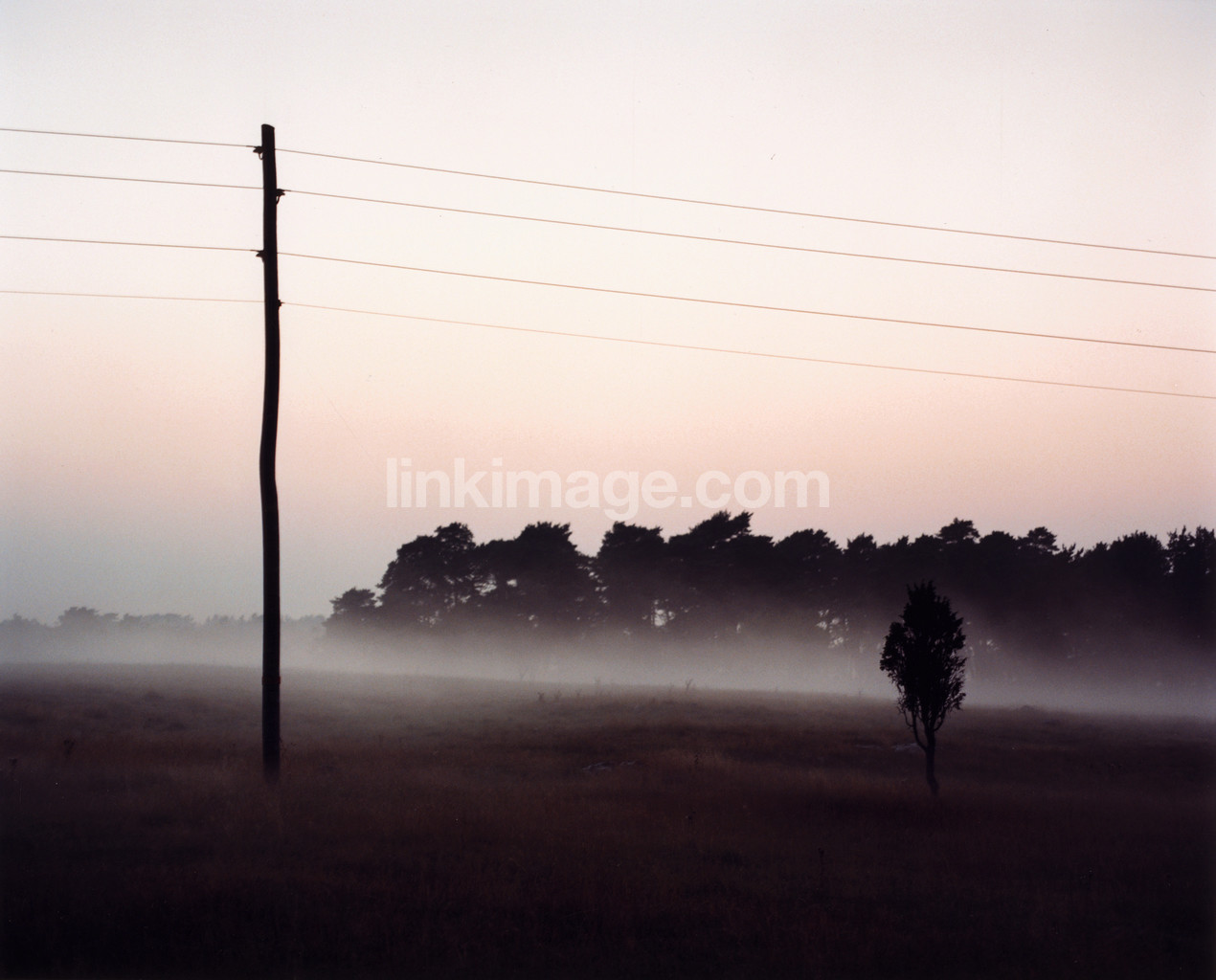 field, fog, obscured, obscurity, haze, tree, dusk, dawn, bush, pole, cable, telephone, forest, fate, solitary, sky, bk618