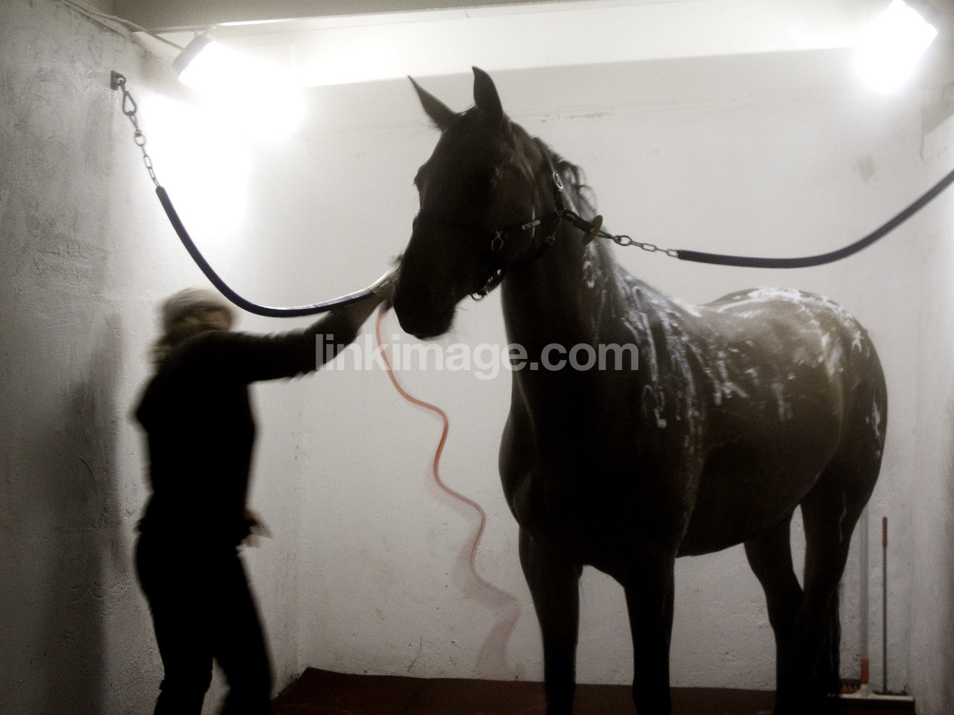 - horse, horse wash, wash, showering, care, animal care, shampoo, scrub, clean, female, chained, flush, water