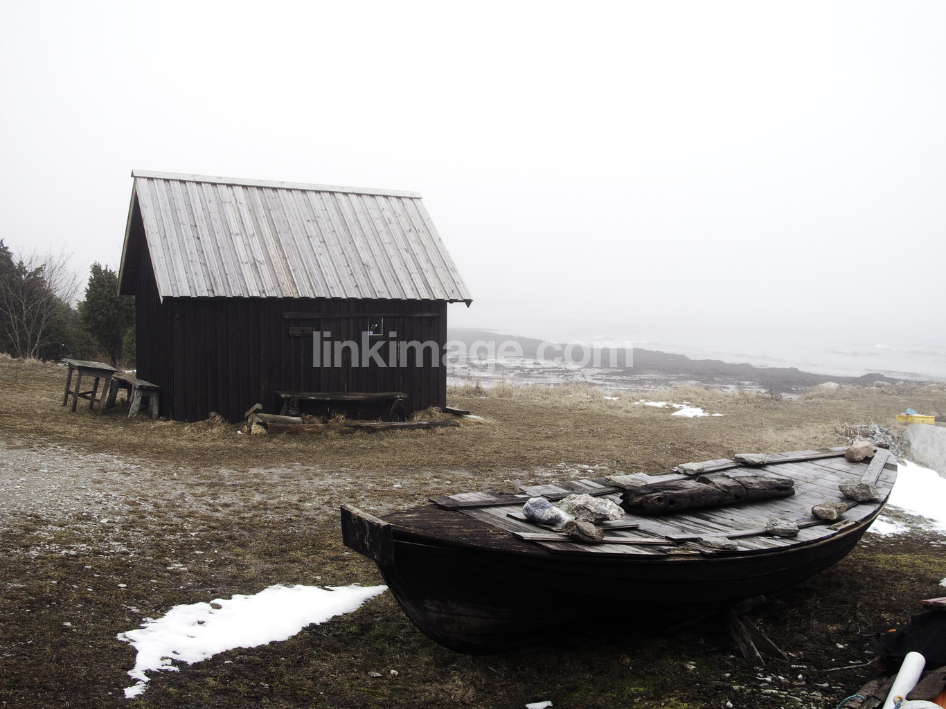 coast, fog, boathouse, bod, boat, spring, fishing, sea, spot, sky, haze