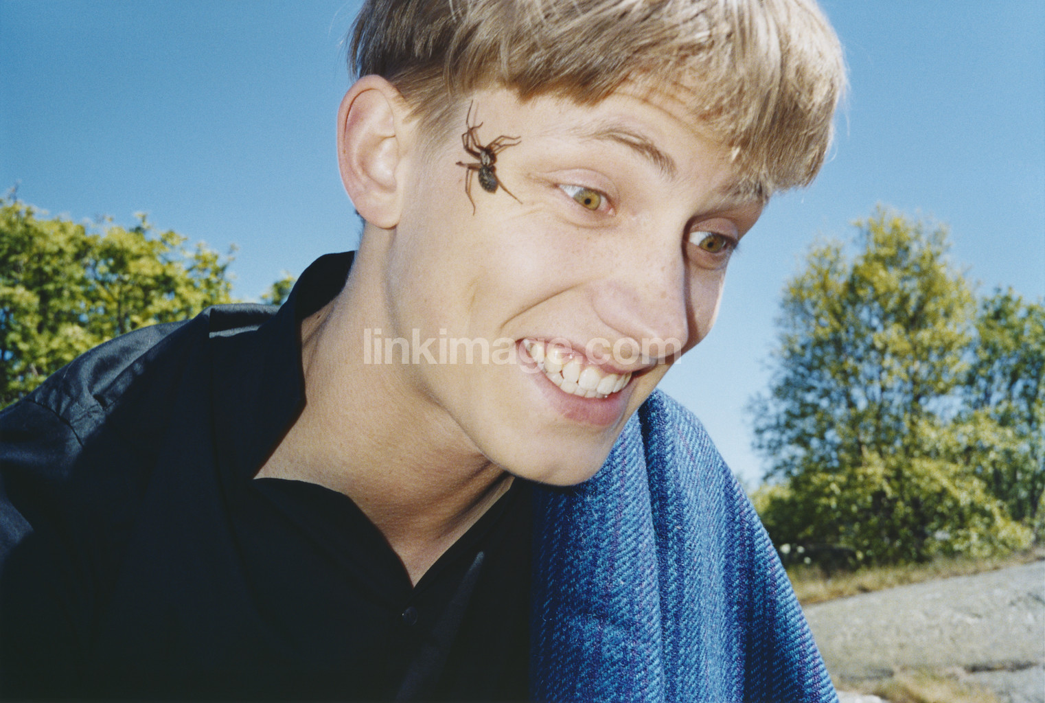 - male, boy, bont, hair, spindle, large, face, in, terrified, white, teeth, summer, sun, blue, sky