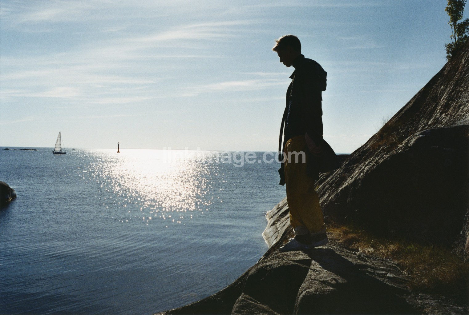 - male, nature, human, in, summer, sun, backlight, silhouette, sailboat, horizon, water glitter, sea, archipelago, rocks, mood