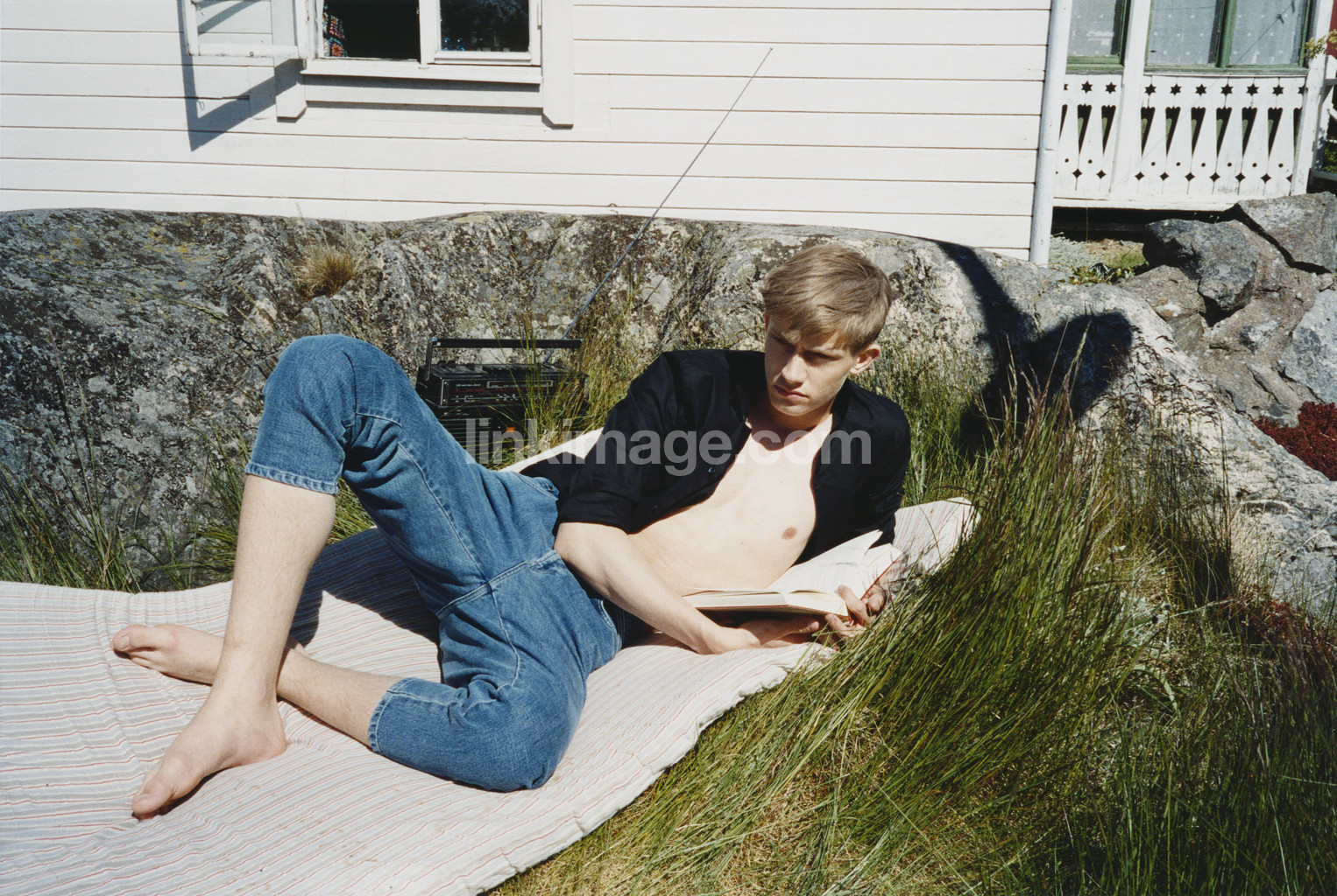 guy, male, jeans, reads, book, literature, listening, radio, quiet, summer, body, pleasure, blanket, cut, summerhouse, archipelago, sun, sunbathing