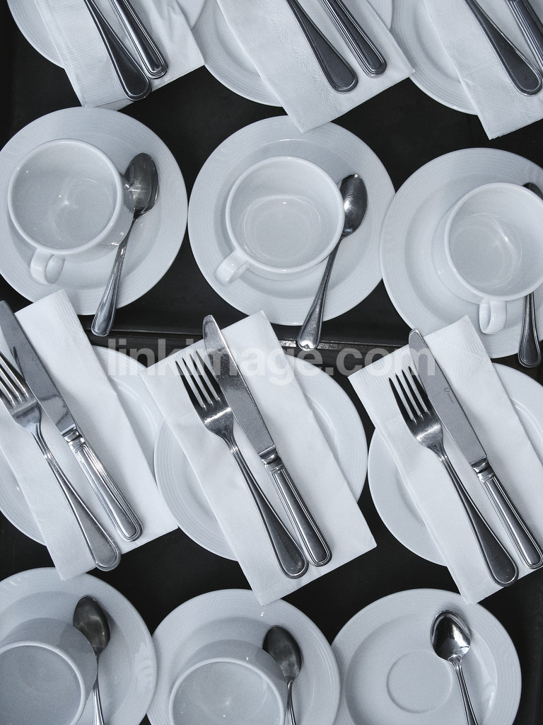 - ducat, direction, coffee cup, cutlery, knives, spoons, forks, copper, dishes, napkins