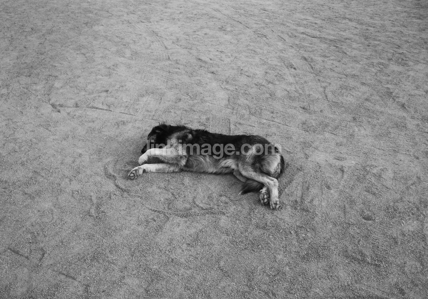 - street, hot, animals, dog, rest, sleep, gravel, tired