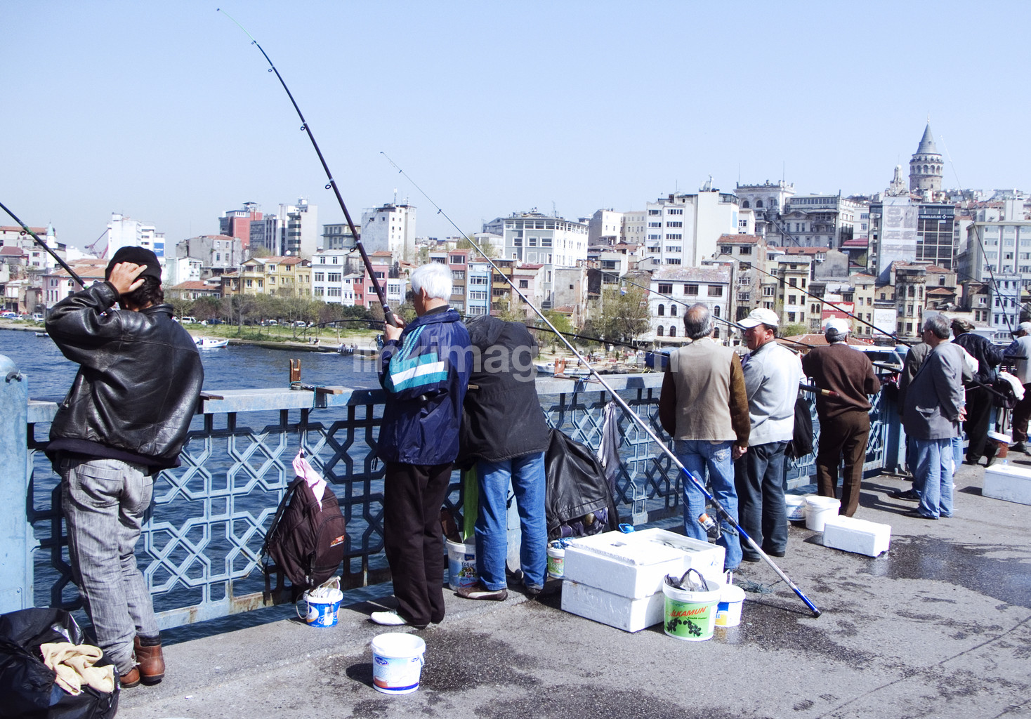 fisherman, stay, leisure, sky, blue, city, istanbul, male, fishing rod, fish, water, bridge