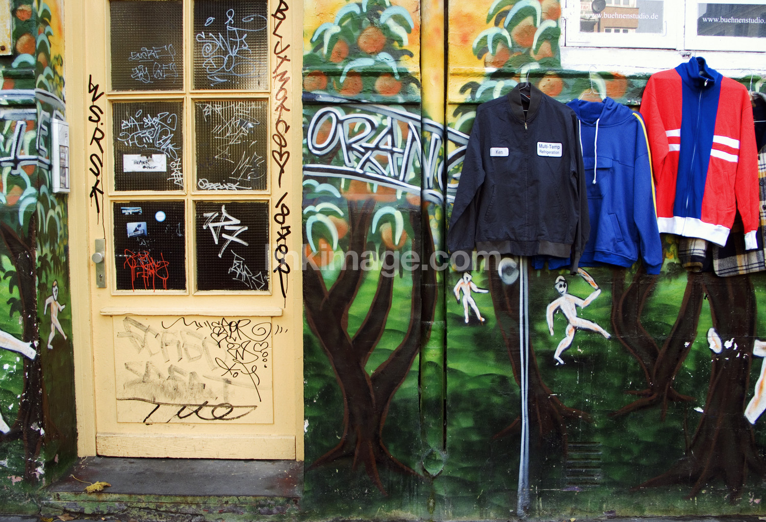 house, graffiti, worn, patina, city, germany, store, clothes, text, jackets, shirts, door, window