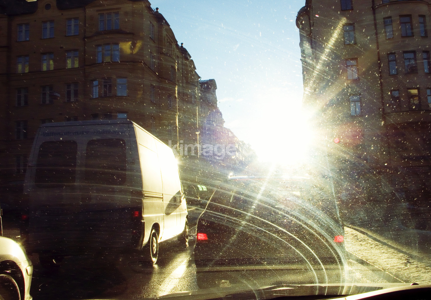 - sky, city, traffic, cars., backlight, windshield, house, buildings