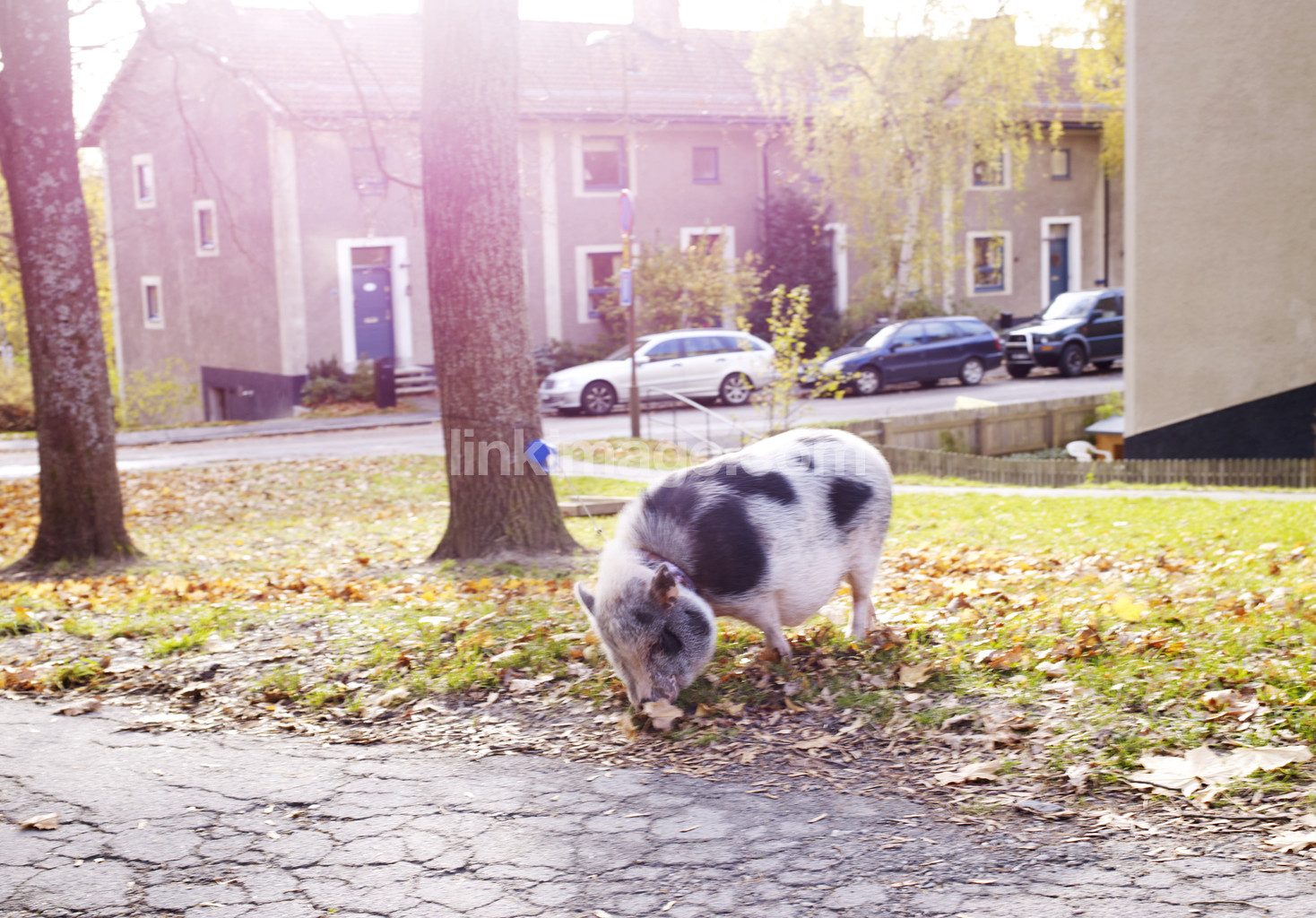 - pork, animals, pet, morning, tree, house, buildings