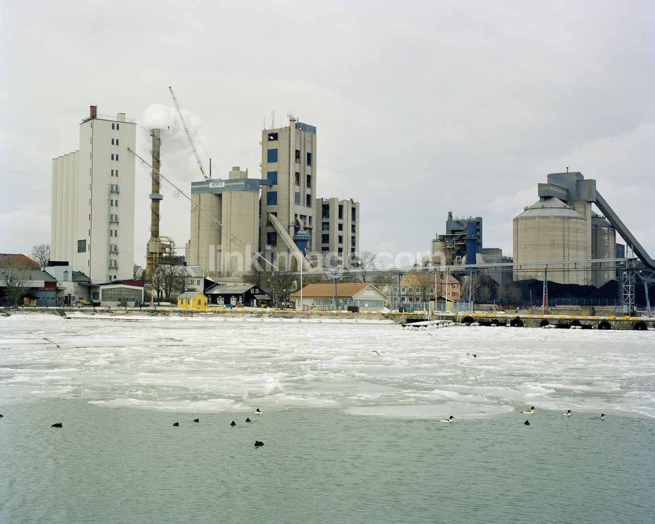 - cement plant, factory, port, winter, birds, ice, water, industrial, tower, buildings