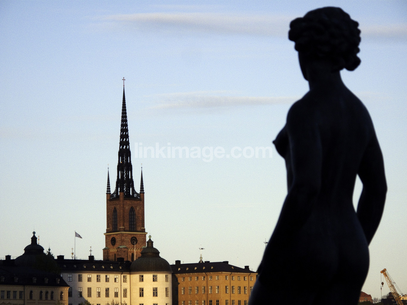 view, city, church, statue, naked, female, breast, body, religion, tower, architecture, sky, cloud