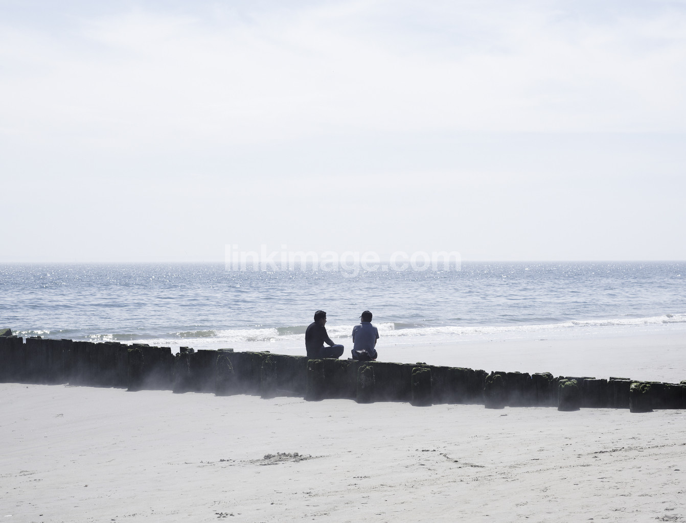 people, persons, two, shore, sand, water, sea, light, resting, sitting, horizon, sky blue
