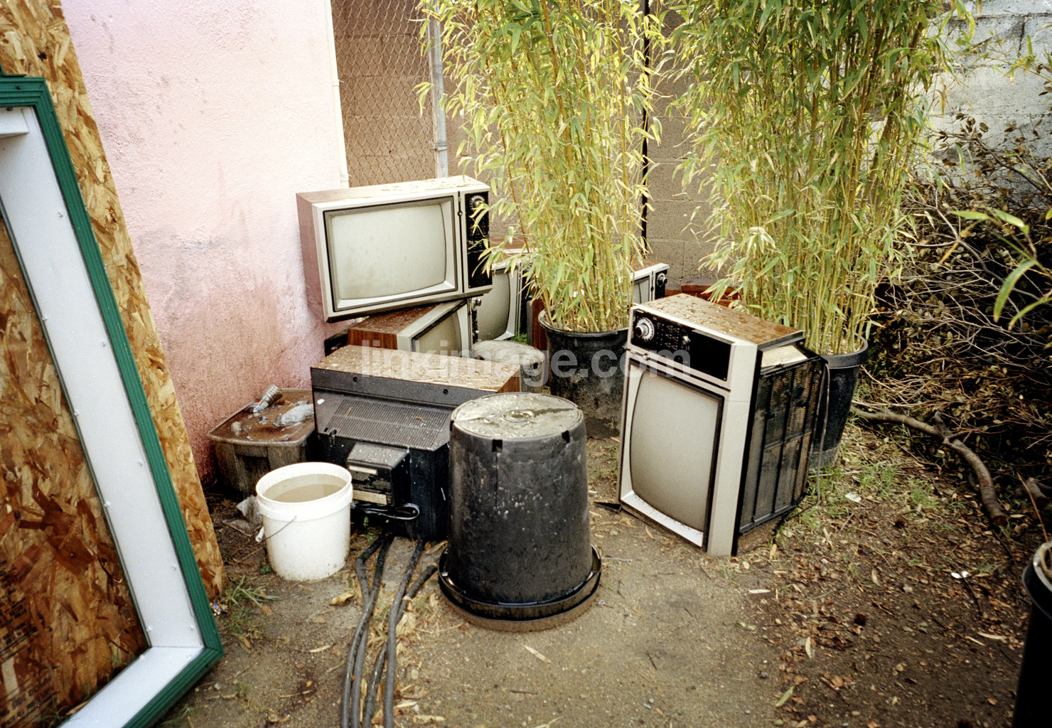 tv, appliances, broken, throw, dump, forgotten, old, backyard, bucket, pails, plants, potted