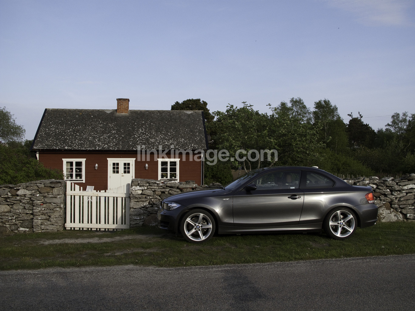 - car, new, car buying, cottage, summerhouse, country, country built, red, dusk, gate