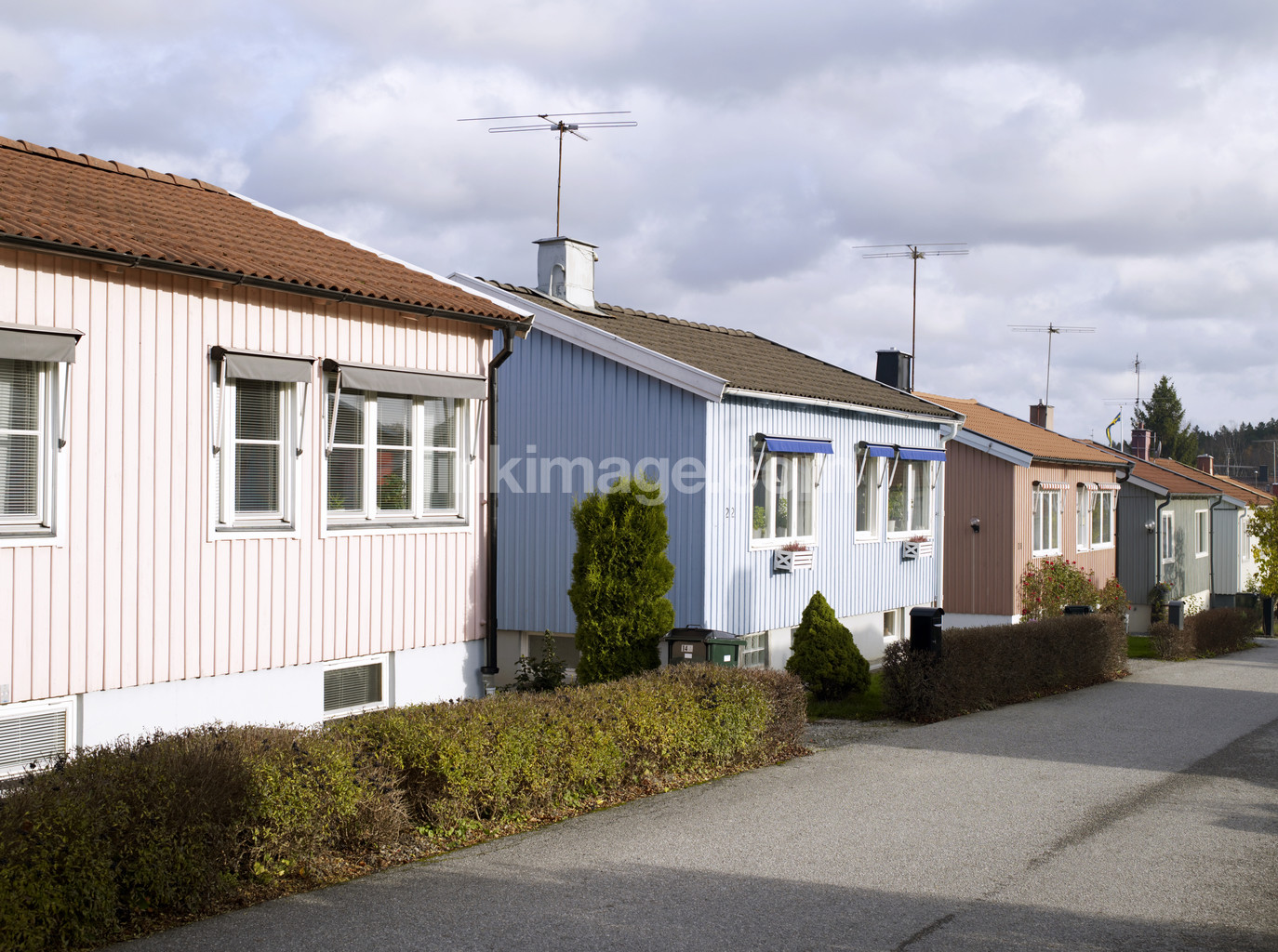 suburb, colors, house, home, street, housing, road, villa, townhouse, area, antenna, stack, bush, hedge