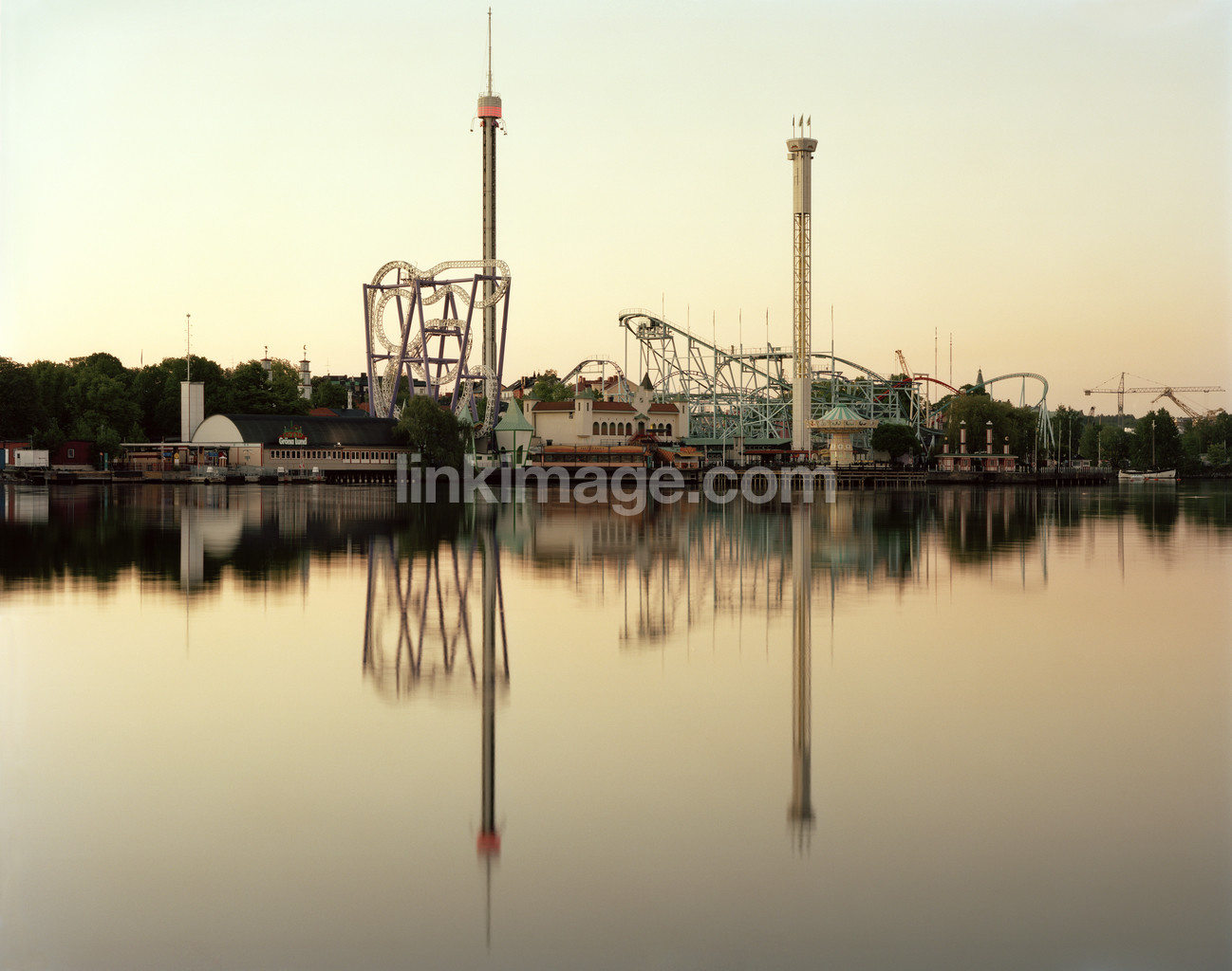 amusement park, green, grove, water, sea, lake, mirror, funfair, rock, and, coaster, pleasure, dusk, carousel