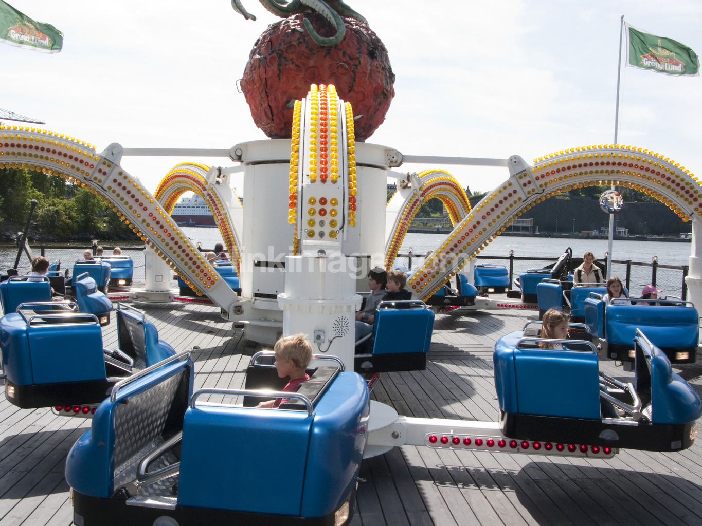 - ride, leisure, spin, go, fun, shadow, water, sky, people