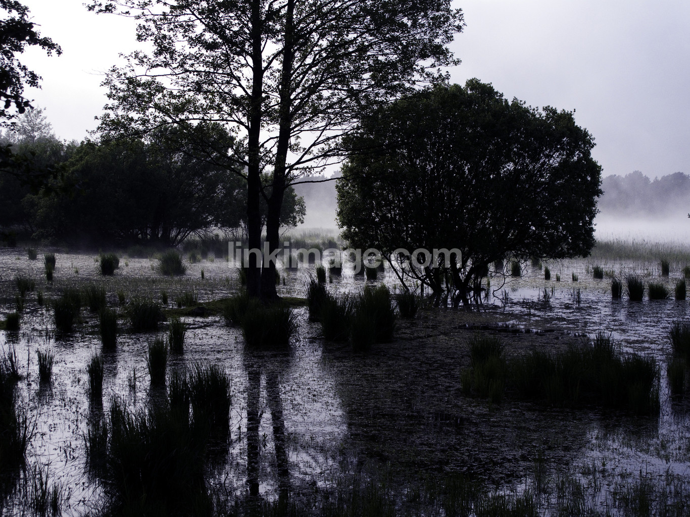 lake, water, fog, light, weather, reflection, dawn, morning, bush, tree, haze