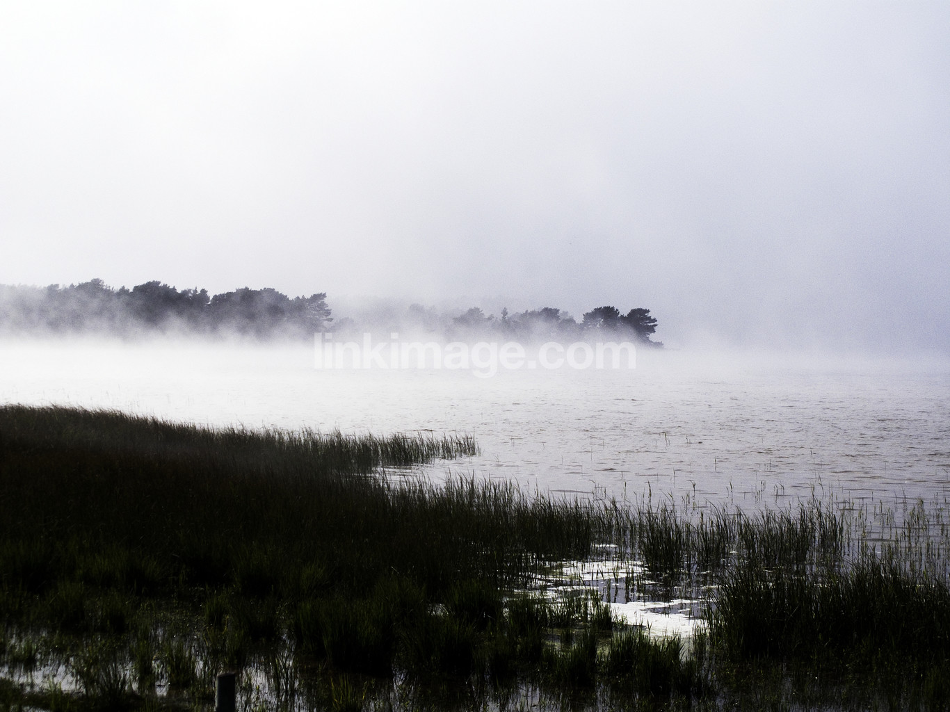 lake, water, fog, view, spot, morning, dawn, light, weather, forest, tree, reed, mood, mystery, haze