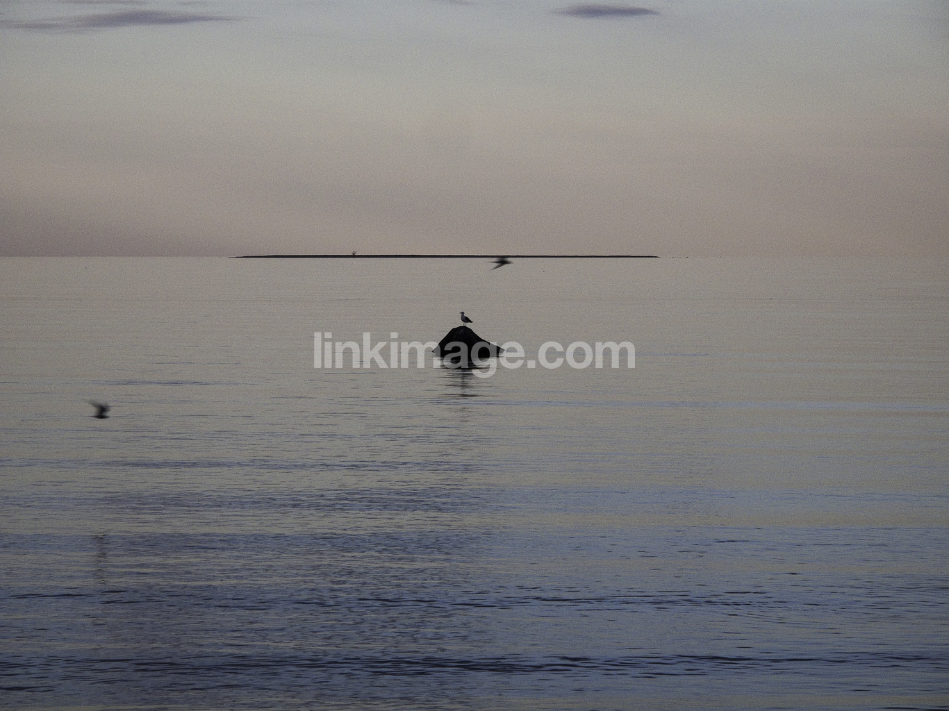sea, water, waves, still, stone, bird, sky, surface, horizon, dusk, evening, colors