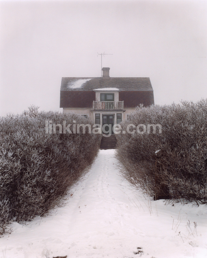 house, home, garden, fog, hedge, footprints, snow, winter, avenue, bushes, shrubbery, plants, bk735