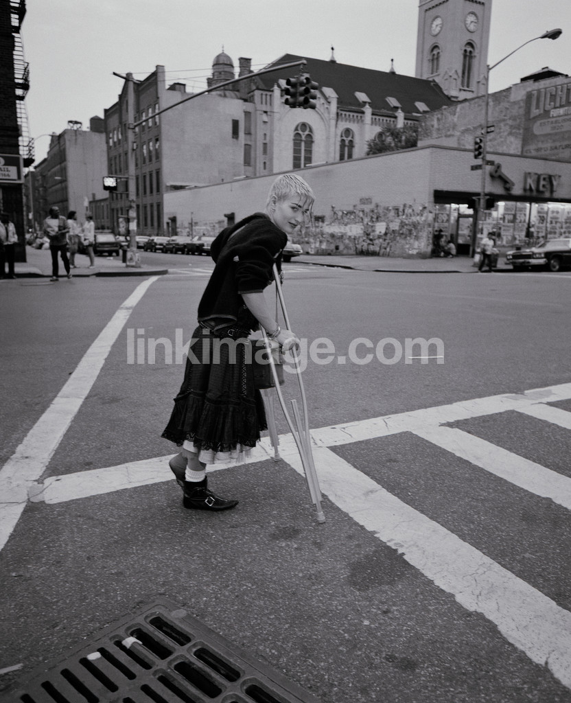 - female, girl, crutches, damaged, fashion, transition point, street, city, gaze, eyes