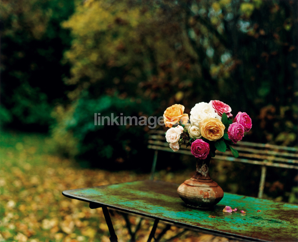 - still life, flower, flowers, bouquet, vase, rose, love, table, rust, spring, fall, garden, park
