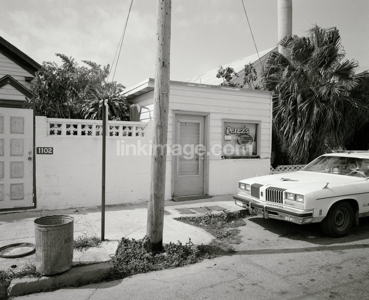 - barber, hairdresser, car, pavement, dustbin, post, buildings, street, parked
