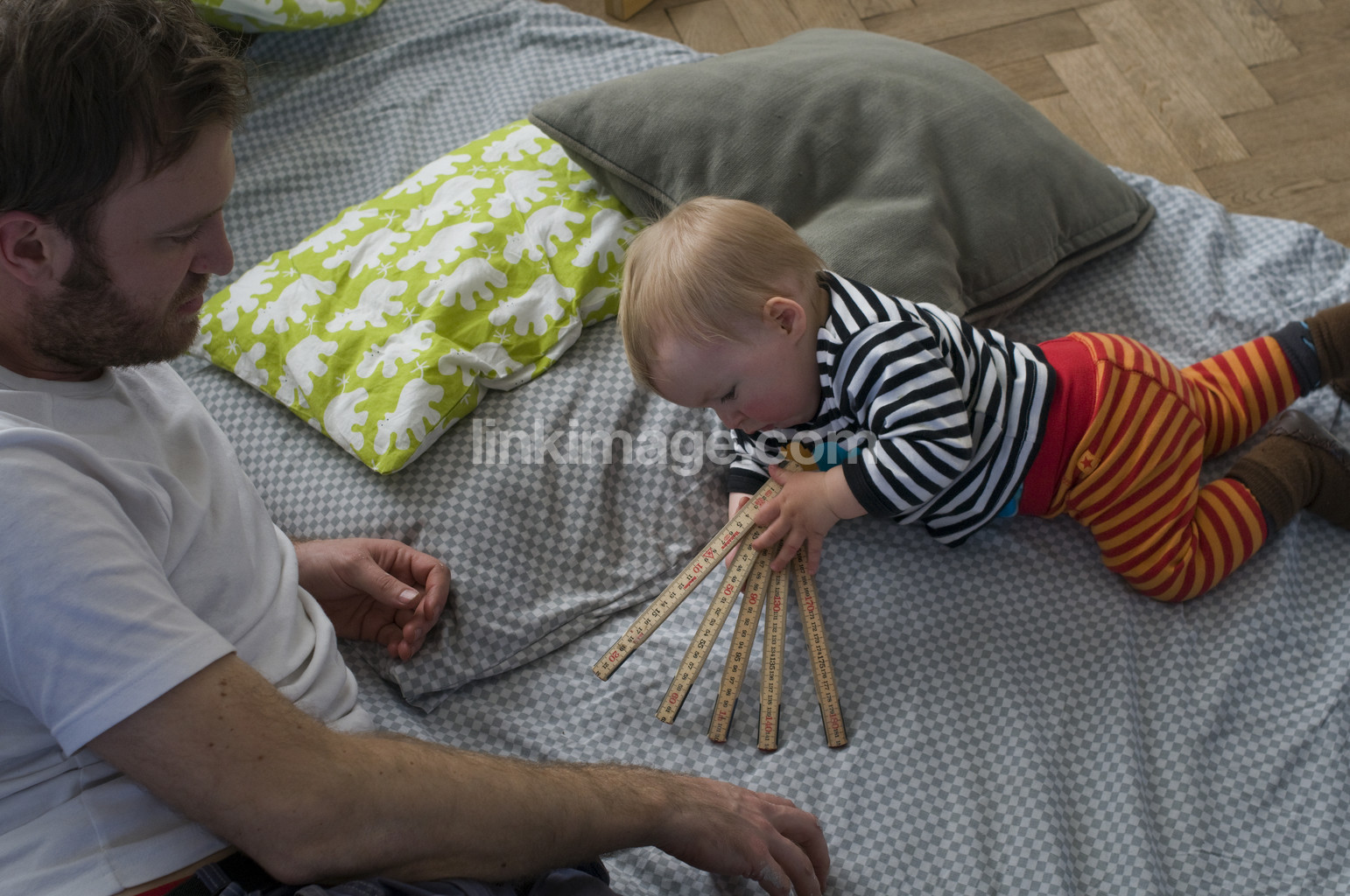 baby, children, boy, play, father, son, creep, floor, foot rule, gear, dad
