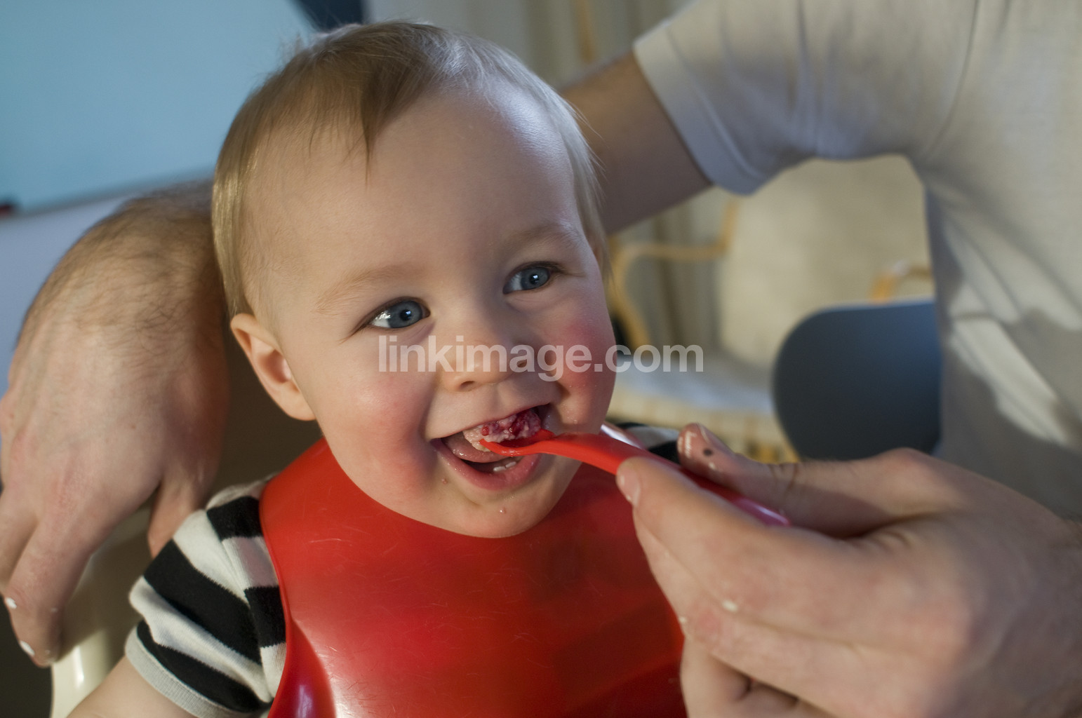 baby, children, boy, feed, hand, spoon, happy, gape, bib, fed, smile, or, laughter