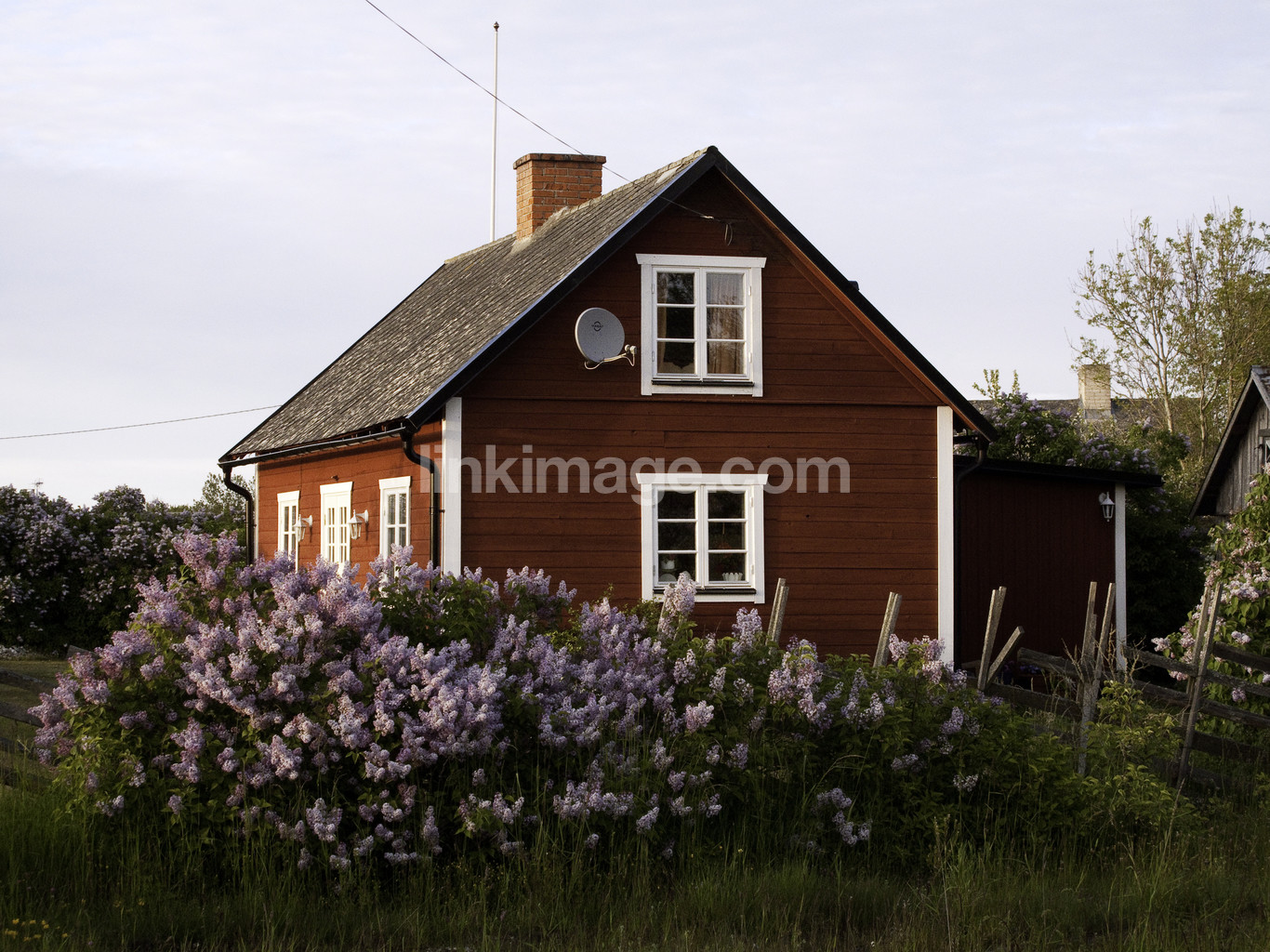 - red, cottage, sweden, swedish, summer, spring, oxygen bush, lilac, satellite, tv, holiday, leisure, shrubbery, house