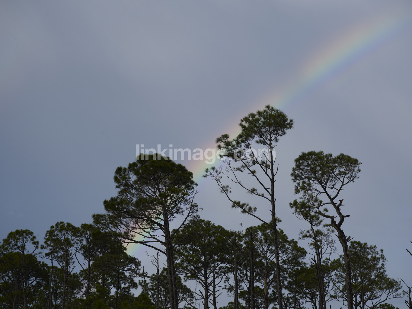 - rainbow, tree, tree tops, tree crowns, silhouette, sky, blue, branches, colors