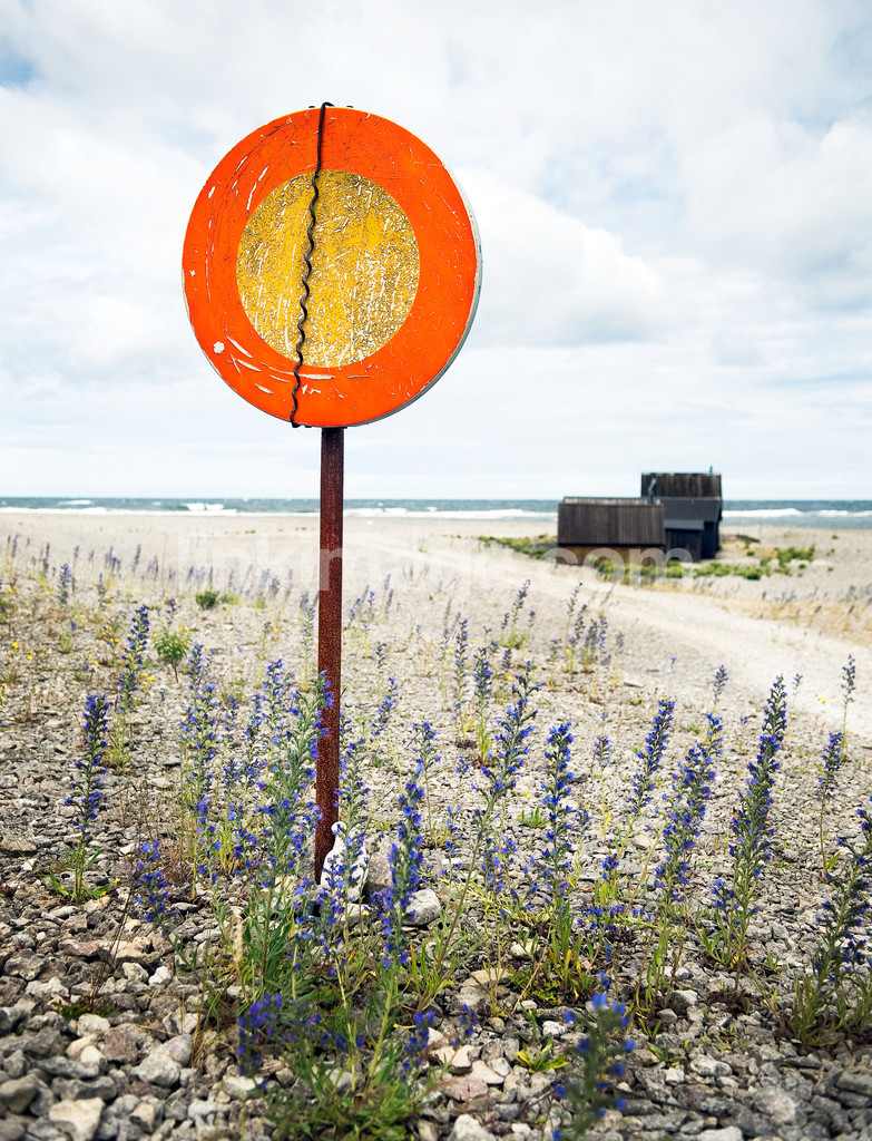 - sign, stop, end, road, shore, stone, gotland, fishing village, solitary, fate, sea, viper's bugloss, summer, horizon