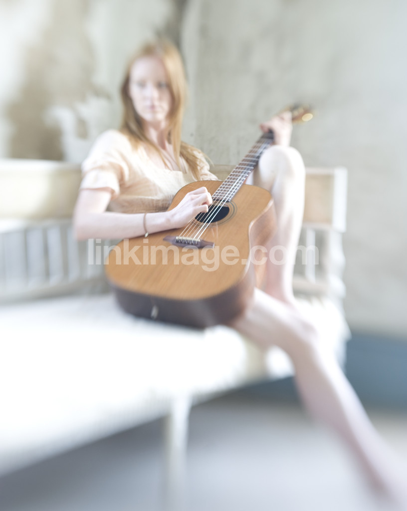- female, guitar, blur, music, dream, worn, bench