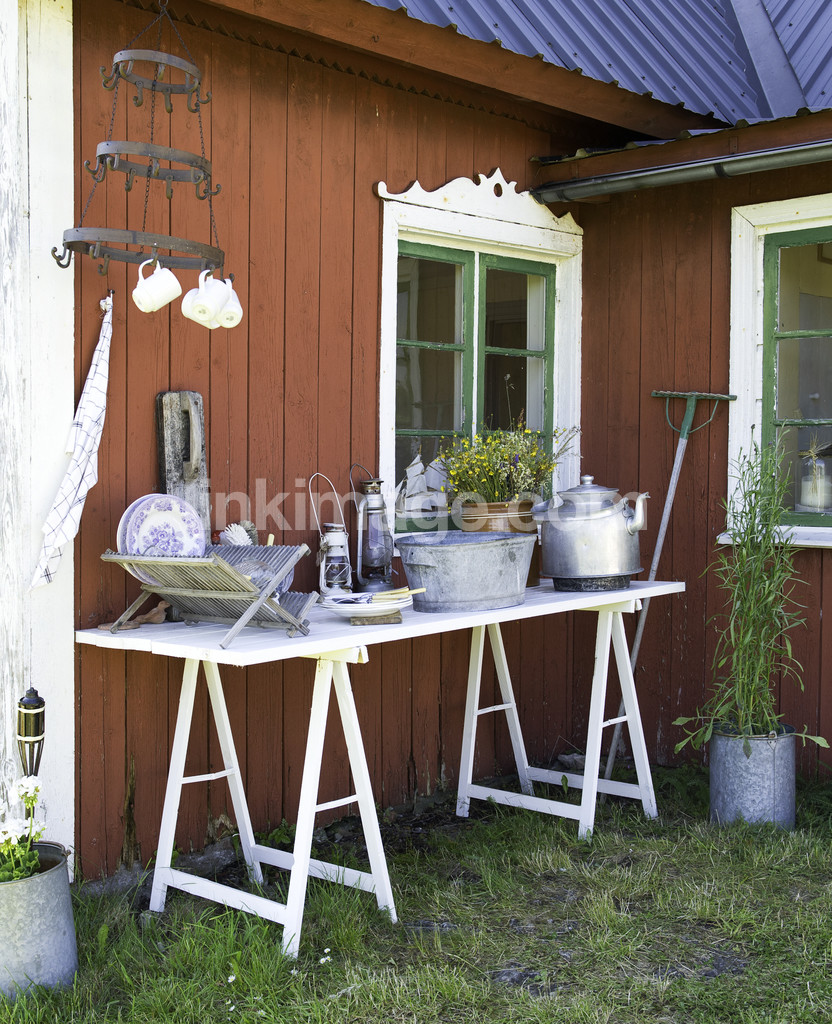 croft, wall, falun red, sink, wash, summer, cottage, window, table, bench, flowers