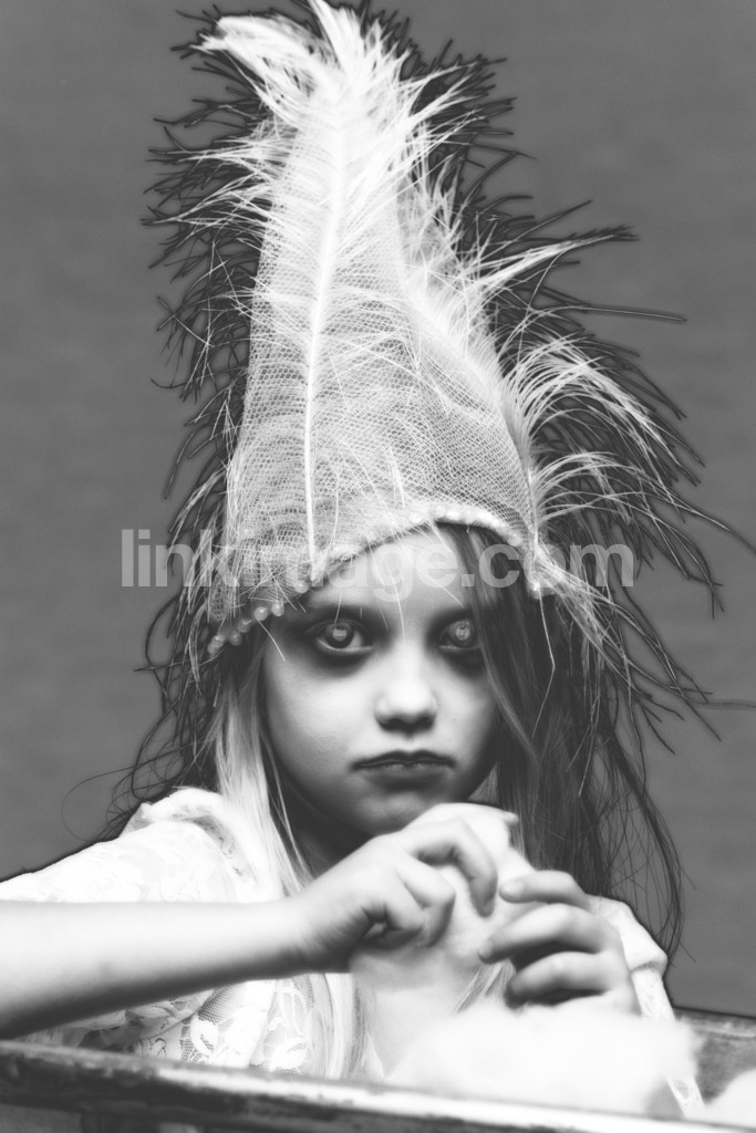 - children, girl, hat, sitting, eyes, feathers, masquerade