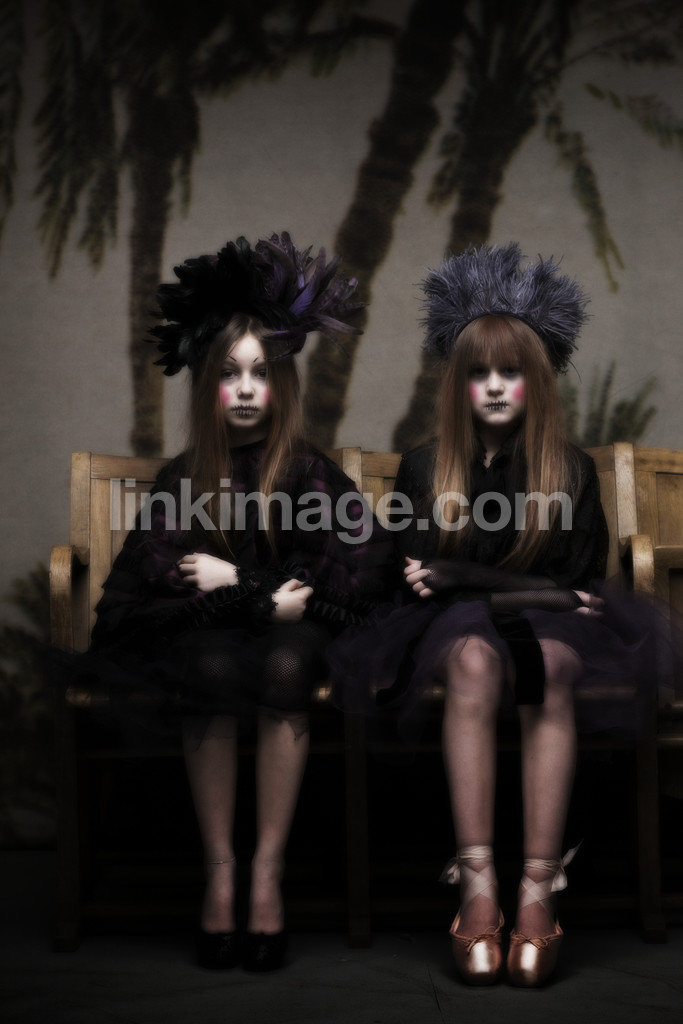 - girls, adolescents, girls, caps, cheeks, palms, sitting, bone, dark, makeup, feathers