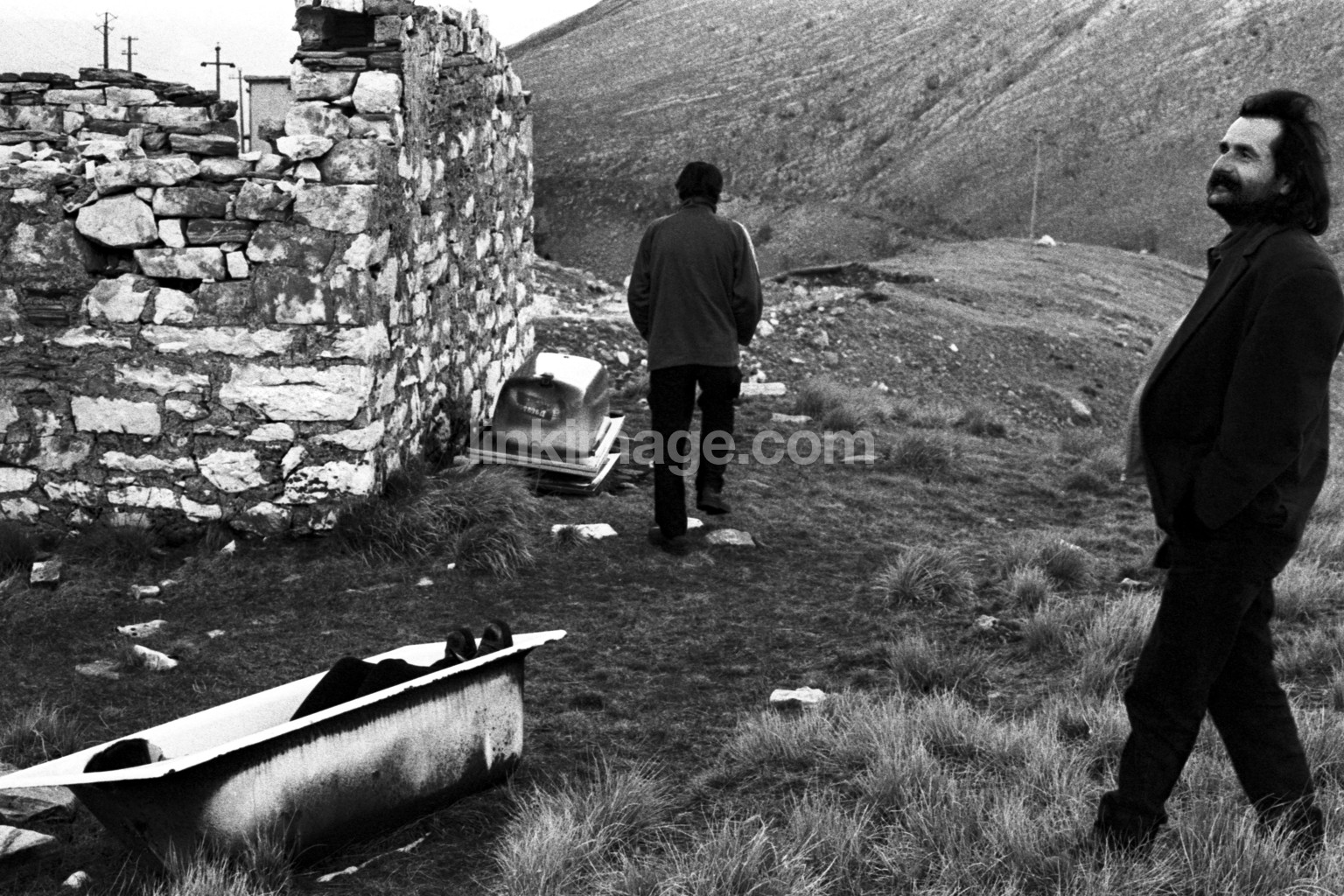 - by, stones, people, guys, male, grass, litters, tub, broken, worn, house, old, abandoned