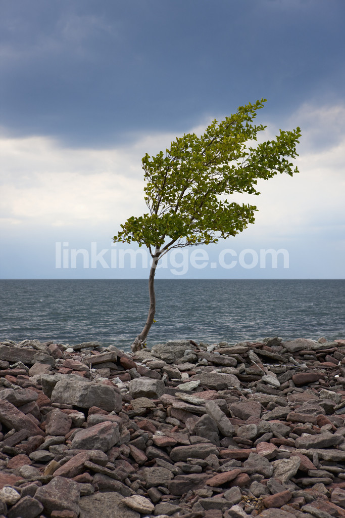 tree, obliquely, greens, stones, water, lake, sea, alone, fate, cloud, sky, leaf, branches, blown, blowing, wind, strain